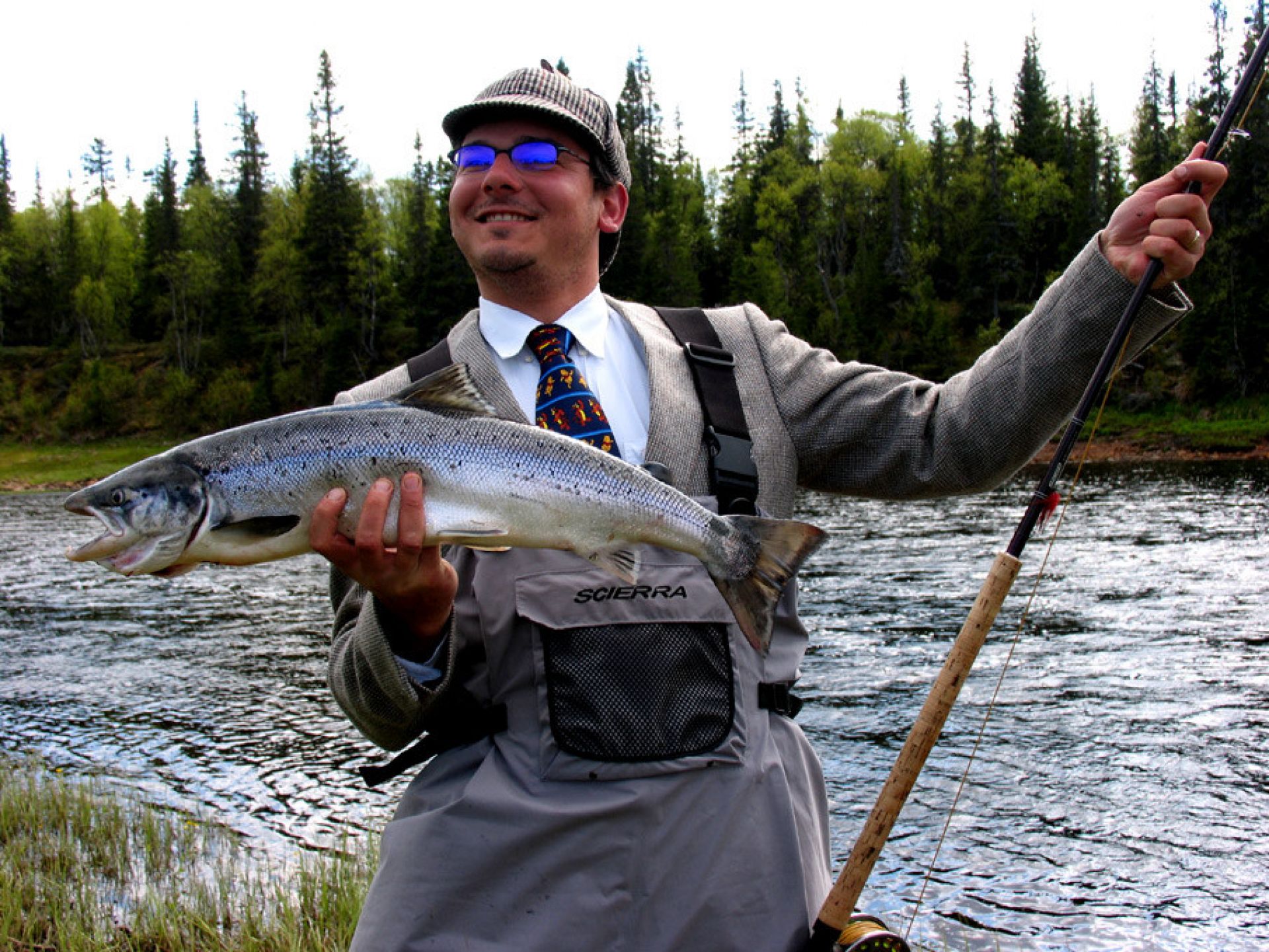 Kolejny dzień albo już noc, Sqrek wychodzi z namiotu gotowy iść łowić. Wszyscy wybuchamy śmiechem, nikt nie wierzy w to co widzi. Patrząc od dołu wszystko się zgadza: buty do brodzenia, spodnie z goretexu. Jednak od pasa w górę coś nie pasuje, spod spodni wystaje wełniana marynarka o bardzo klasycznym kroju, spod niej, biała koszula (prawie nie pognieciona), u szyi uwiązany krawat w Kubusie Puchatki a na głowie czapka, której nie powstydziłby się Sherlock Holms. Dźwigając to wszystko przez te bezdroża Sqrek oddał hołd pewnej wędkarskiej tradycji, która zaczęła się na wyspach, oddał hołd łososiom bo tak szlachetne ryby należy łowić tylko w garniturze a przy okazji ubawił nas i Państwa, którzy go możecie oglądać na zdjęciach.